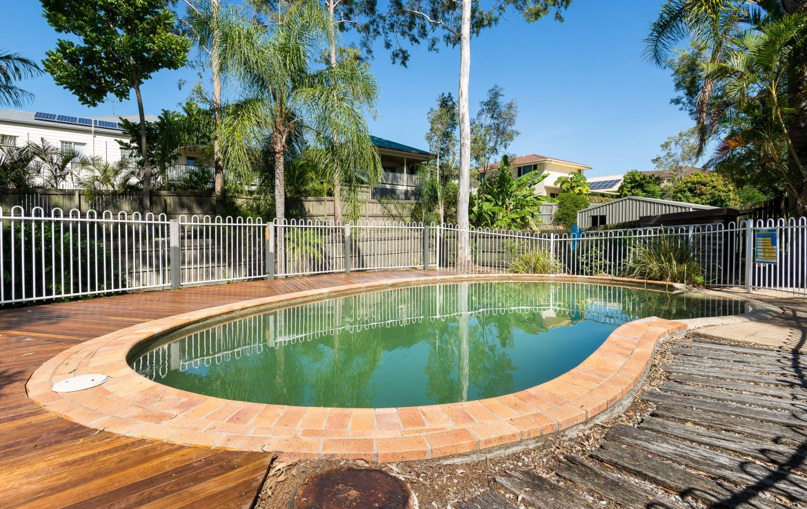• Sparkling pool with wooden decking within a fenced pool area