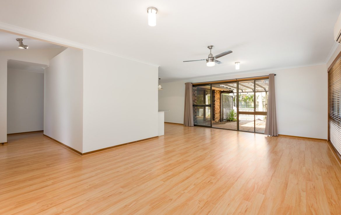 • Large L-shaped living room with wood flooring and split system air-conditioning